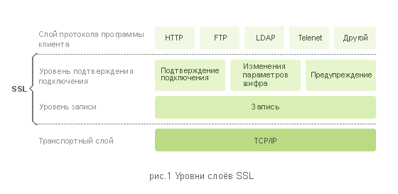 Безопасный SSL протокол размещается между двумя протоколами: протоколом, который использует программа-клиент (HTTP, FTP, IMAP, LDAP, Telnet и т.д.) и транспортным протоколом TCP/IP. Создавая своего рода заслонки с обеих сторон, он защищает и передает данные на транспортный уровень. Благодаря работе по многослойному принципу, SSL протокол может поддерживать много разных протоколов программ-клиентов.